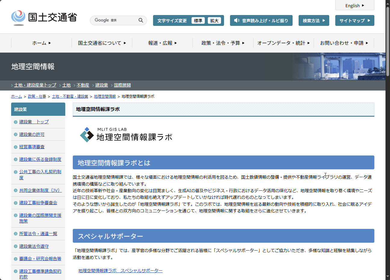 地理空間情報課は2024年11月、地理空間情報に関する最新動向や最新技術、新しいアイデアを政策に採り入れるため、アイデアの拾い上げや多様な人材とのコミュニケーションを行う場として、新サイト「地理空間情報課ラボ」を開設しました。