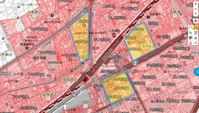 地図印刷(PDFダウンロード)および画像作成機能については、表示中の地図をB5~A3サイズでPDF出力またはPNG画像として保存できます。4段階の解像度指定やタイトル入力にも対応し、提出書類やプレゼン資料に活用できます。図形入力機能としては、地図上にラインやポリゴンを自由に描き込むことが可能となります。図形編集や色の変更、データのインポート・エクスポートにも対応します。