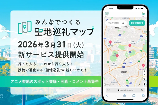 同サービスは、日本全国のアニメ作品の舞台(聖地)を地図上で可視化するウェブサービスです。同社が2025年8月に提供開始した総合アニメ体験メディア「聖地巡礼マップ」の記事コンテンツと連動しながら、ユーザー自身が聖地の登録や写真の投稿、コメントの投稿などを行える機能を実装しました。